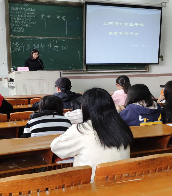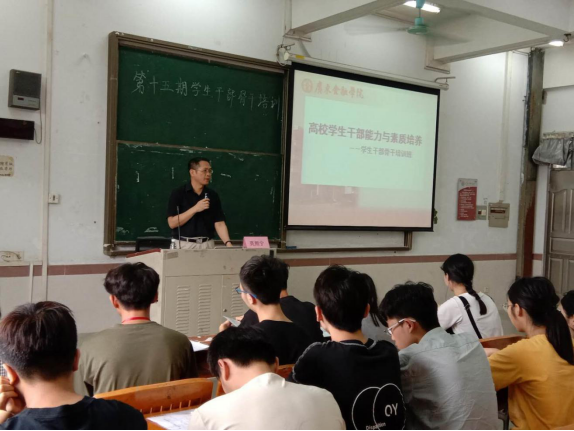 除专题讲座外,学生党支部书记钟科老师针对“团队精神与集体荣誉感的提升”与学生骨干们展开探讨,在课堂互动,让部分干部上台分享自己担任学生干部以来的心得体会,分享经验。钟老师提出各组织之间要多加交流,多筹划活动、多创造交流的机会;大学也犹如一个小社会,同学之间不仅要相互沟通交流,也要相互包容;作为学生干部,要更具责任感,尽自己所能,做好自己的本职工作,学习历届优秀学生干部好的经验做法,届届传承;骨干最重要的是有担当。骨干犹如是将,要有兵到将的转变,提升自己的能力水平,以使自己有独立策划、组织活动的能力。最后,钟老师总结了以下三点:①作为一名学生干部,要起到领头羊的作用;②努力提升自身能力,在工作中独当一面;③学会做事、做人,做一个会自我管理、胸襟开阔、宽容待人之人。